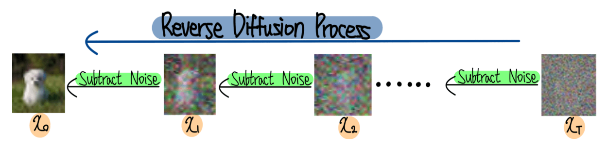 X_t 이미지를 Reverse Diffusion Process로 처리한다면 원본 이미지 X_0이 나타나게 된다.
