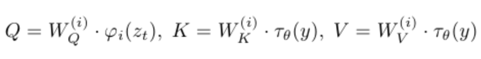 Conditioning Mechanisms: Stable Diffusion은 다양한 Condition 입력 중 한 가지만 입력으로 받는데, 각 입력에 대응하는 Encoder τ가 필요하다. 입력된 Condition은 모델 내에서 연산중인 Image 정보 Z_t 와 연산 되어야 한다. 이 둘의 상관관계를 잘 고려해야하는데 이때 Cross Attention 방법을 가장 많이 사용한다. Attention이란 가중치를 의미한다. Stable Diffusion에 적용된 Cross Attention을 수식으로 표현하면