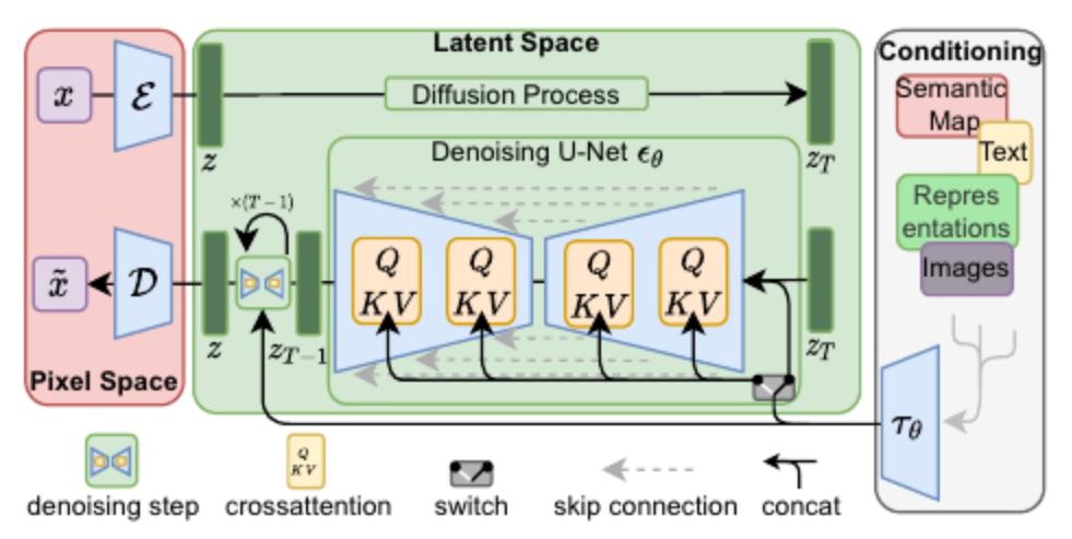 빨간색 영역이 Auto Encoder, 초록색 영역이 Latent Diffusion Model, 회색 영역이 Condition 입력 부분이다. Auto Encoder는 쉽게 말해 입력 데이터를 최대한 압축하고 다시 원본 형태로 복원시키는 신경망이다.
