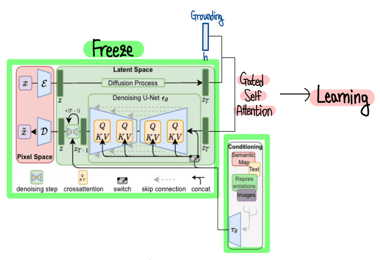 6. Multi Modal Input Image Generation: 5번 Stable Diffusion은 Condition의 형태에 제약이 없지만 하나만 선택해야하며 Diffusion Model을 처음부터 학습하기 위해 엄청난 컴퓨팅 자원을 필요로 한다는 두가지 단점이 존재한다. 이를 극복한 것이 GLIGEN 모델. Stable Diffusion이 그대로 들어가며 Grounding, Gated Self Attention 등을 추가한 것이다.