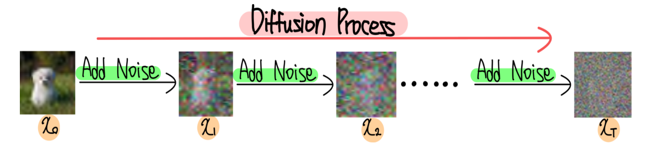 이렇게 흐려진 이미지를 얻을 수 있다. 이런 과정을 Diffusion Process의 Forward라고 한다.