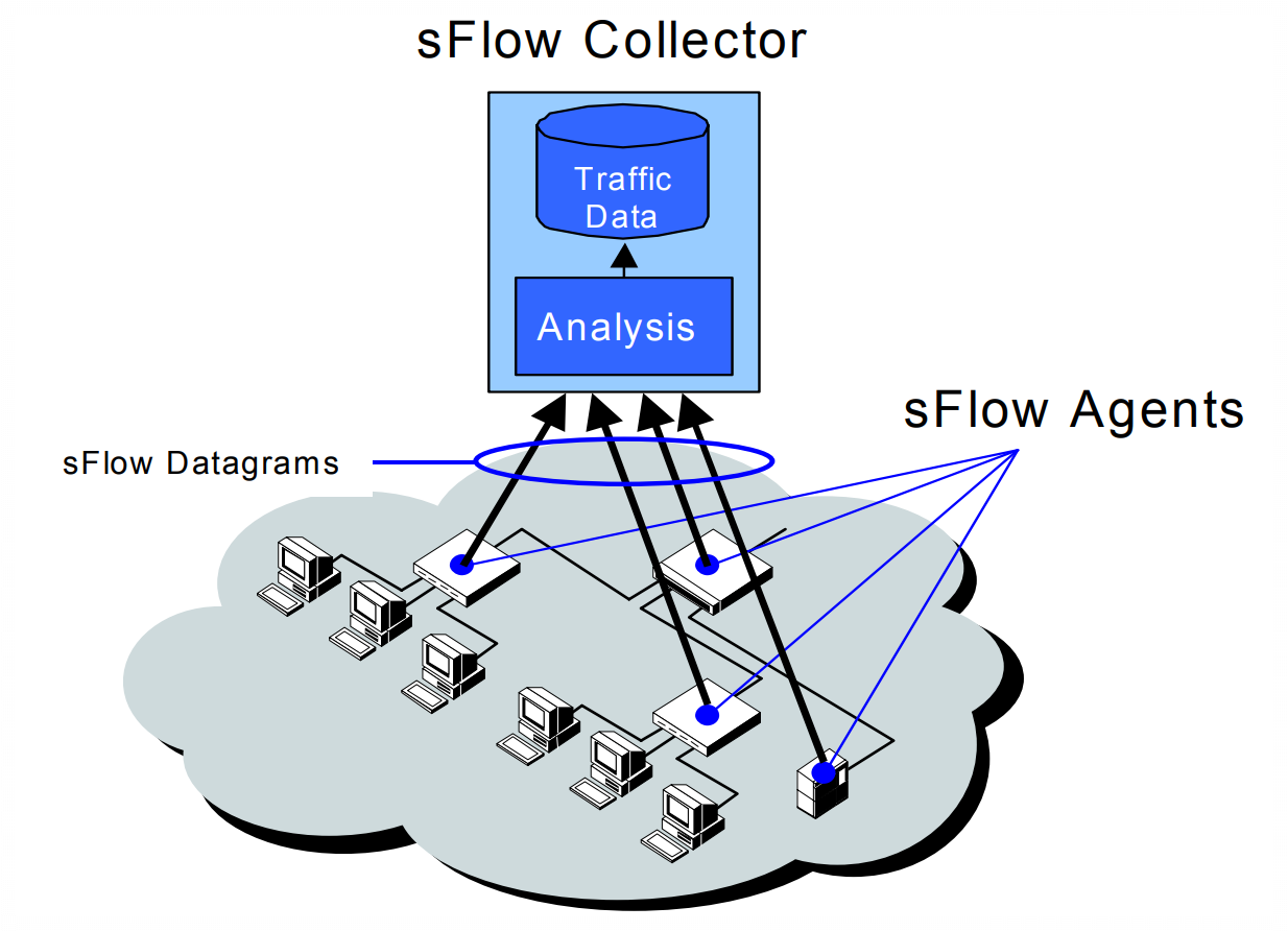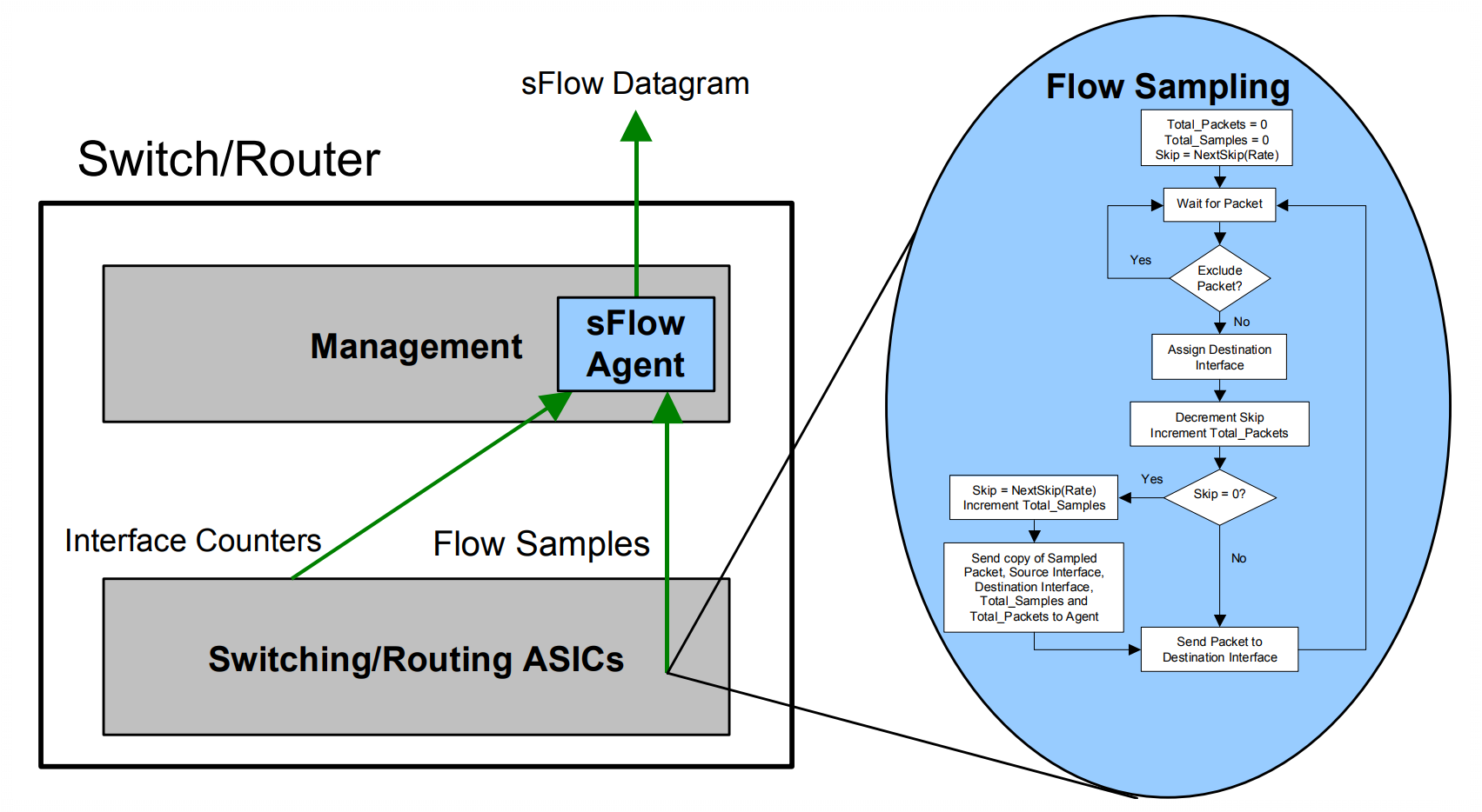 스위치/라우터의 ASIC이 패킷 샘플링 수행 > sFlow Agent가 interface counter와 flow sample을 sFlow datagram으로 만들고 sFlow Collector에게 전달