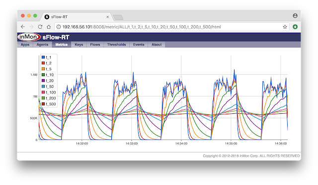 - sFlow-RT의 플로우 레이트는 신속한 탐지나 Large Flow 제어를 위한 것이다. (DDoS 탐지나 로드 밸런싱같은)