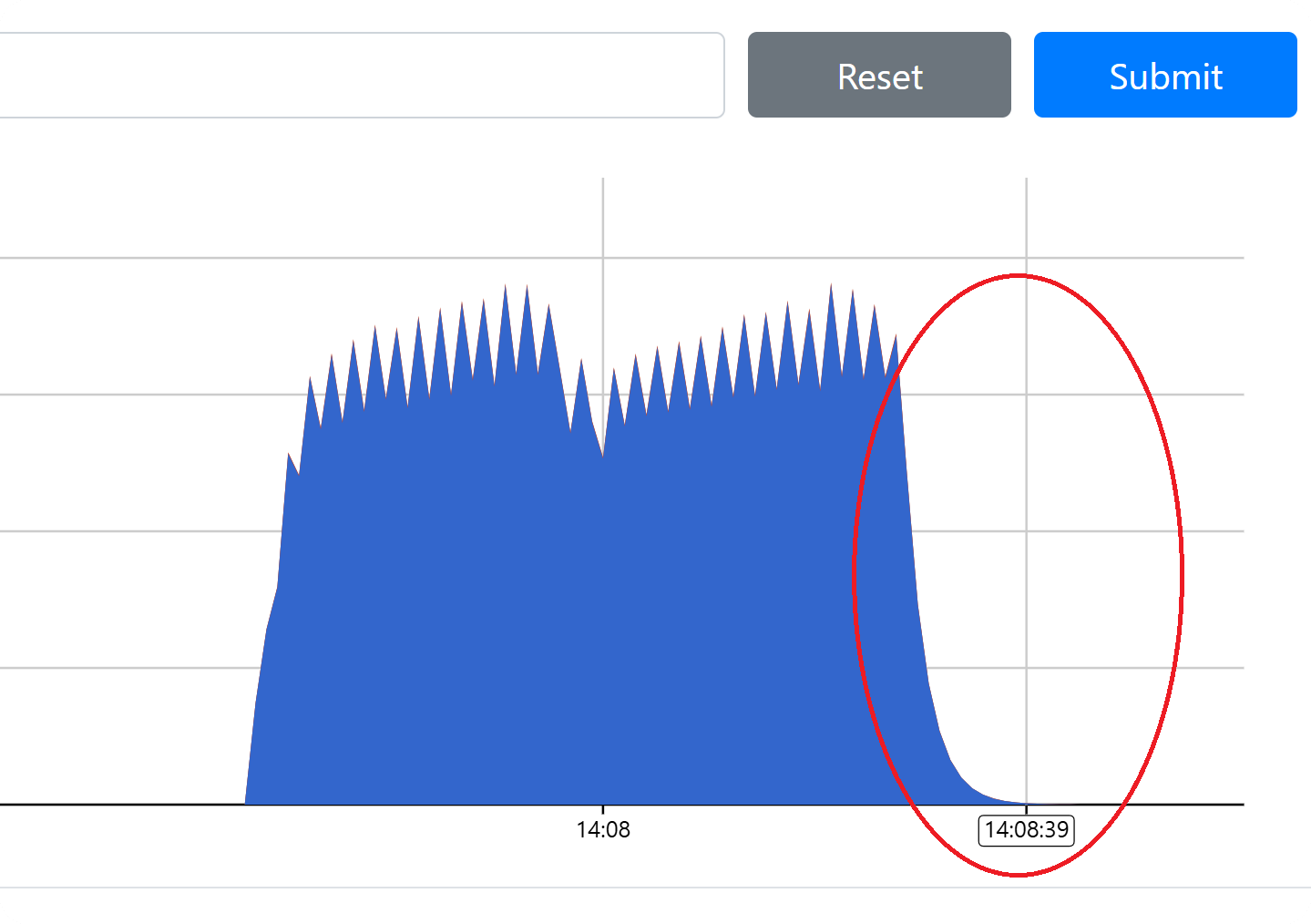 t = 0.8, 70~75초 동안 데이터 지속, 측정값: 812.605983MB