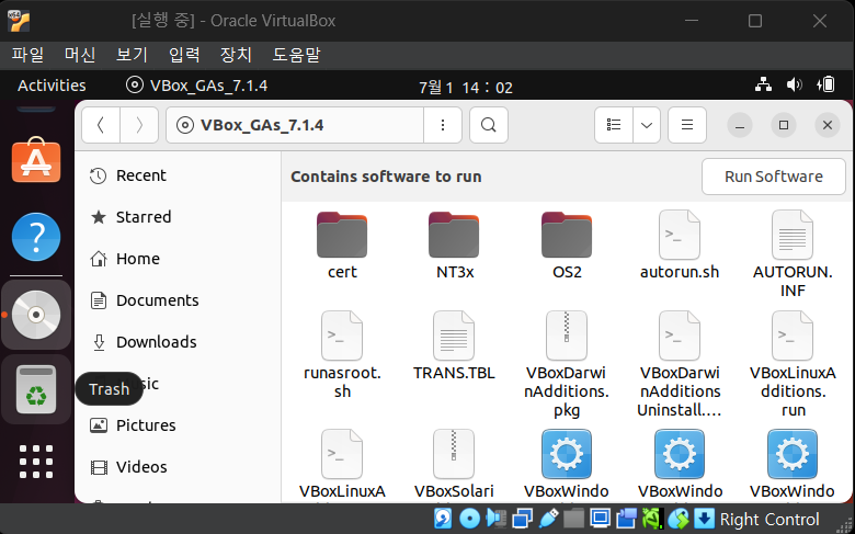 2. 장치 > 게스트 확장 CD 이미지 삽입 > 파일 탐색기 > 추가 디스크 칸의 VBox_GAs_... > 우클릭 > Open in Terminal >
