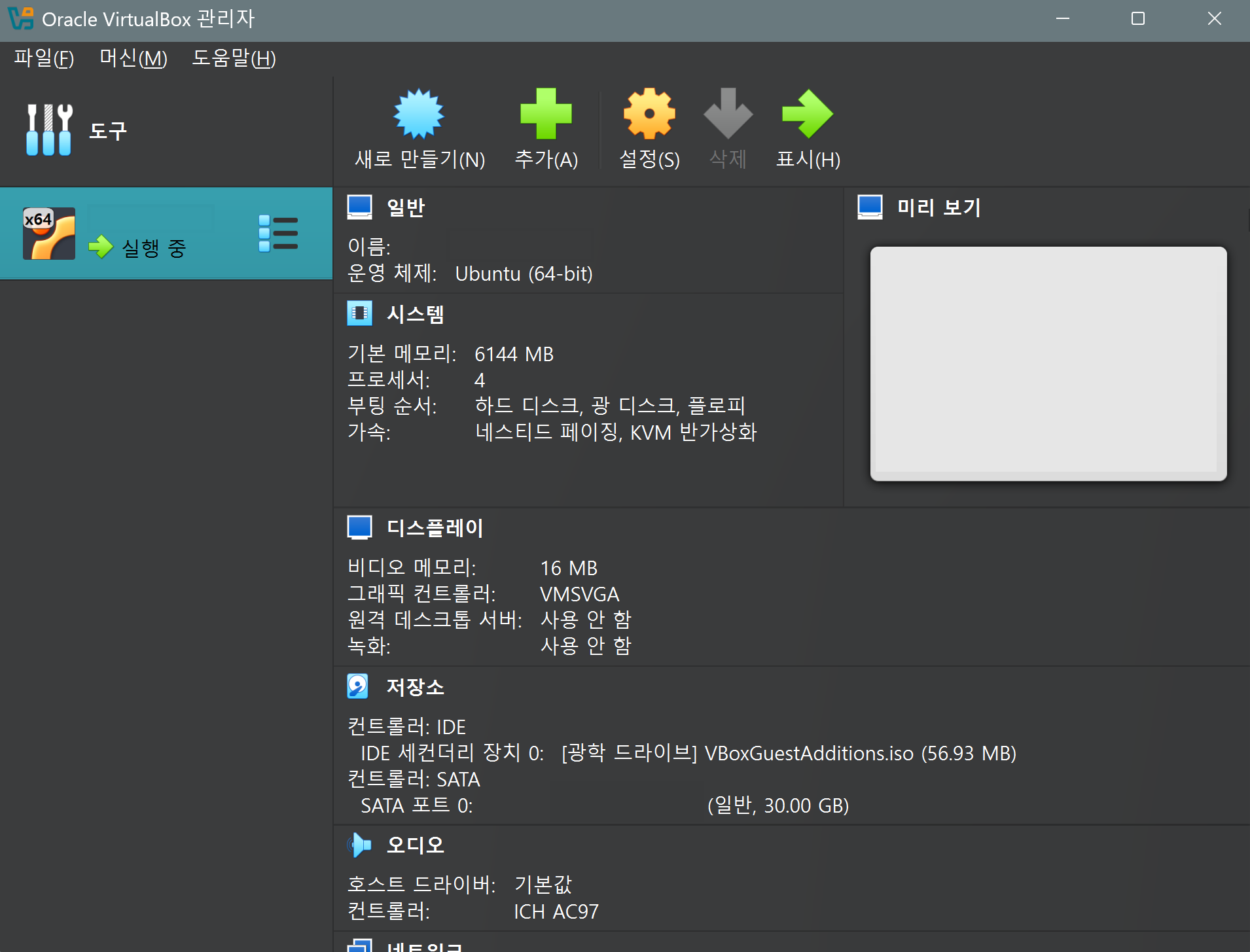 가상머신 종료 > 가상머신 선택 > 설정 > 저장소 > VbBoxGuestAddition.iso > 디스크 모양 선택 > 가상드라이브에서 디스크 꺼내기 이후 2번 다시진행
