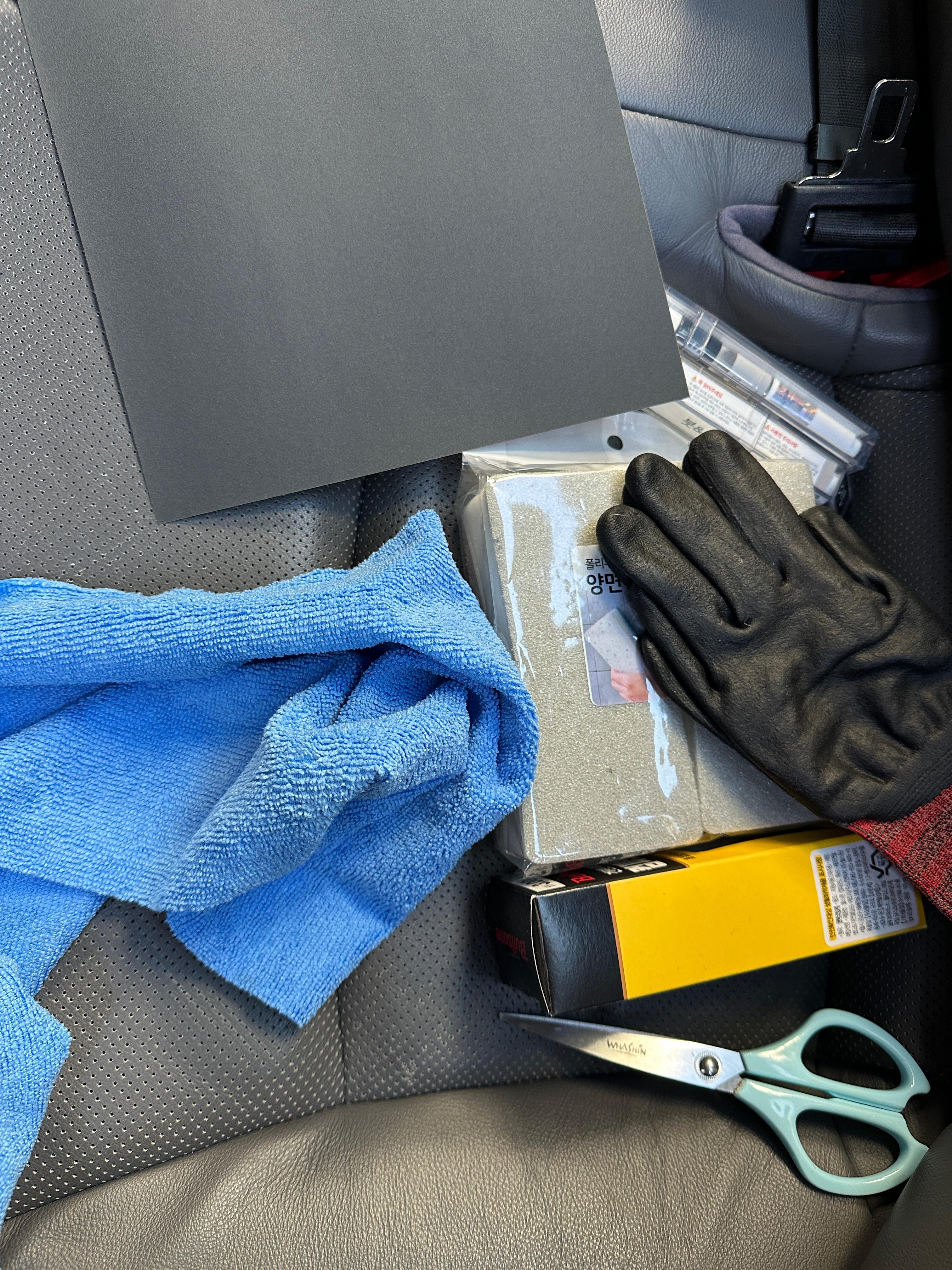 차량용 극세사 천, 녹 제거용 사포 (400방), 붓펜 (차량 모델, 색상 코드 맞춰서 구입) 검정색 / 투명색, 다이소 컴파운드, 스펀지, 장갑